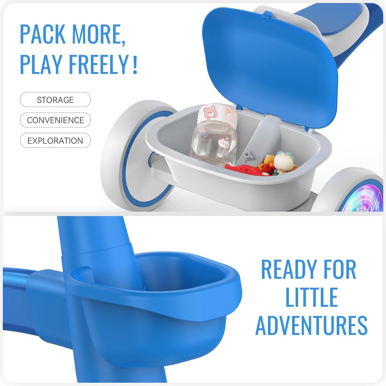JOYFUL SHARING: Detachable front & rear baskets hold cherished toys and snacks, fun colorful light-up rear wheels rotate to glow, no batteries needed, delighting in shared moments of joy with playmates!