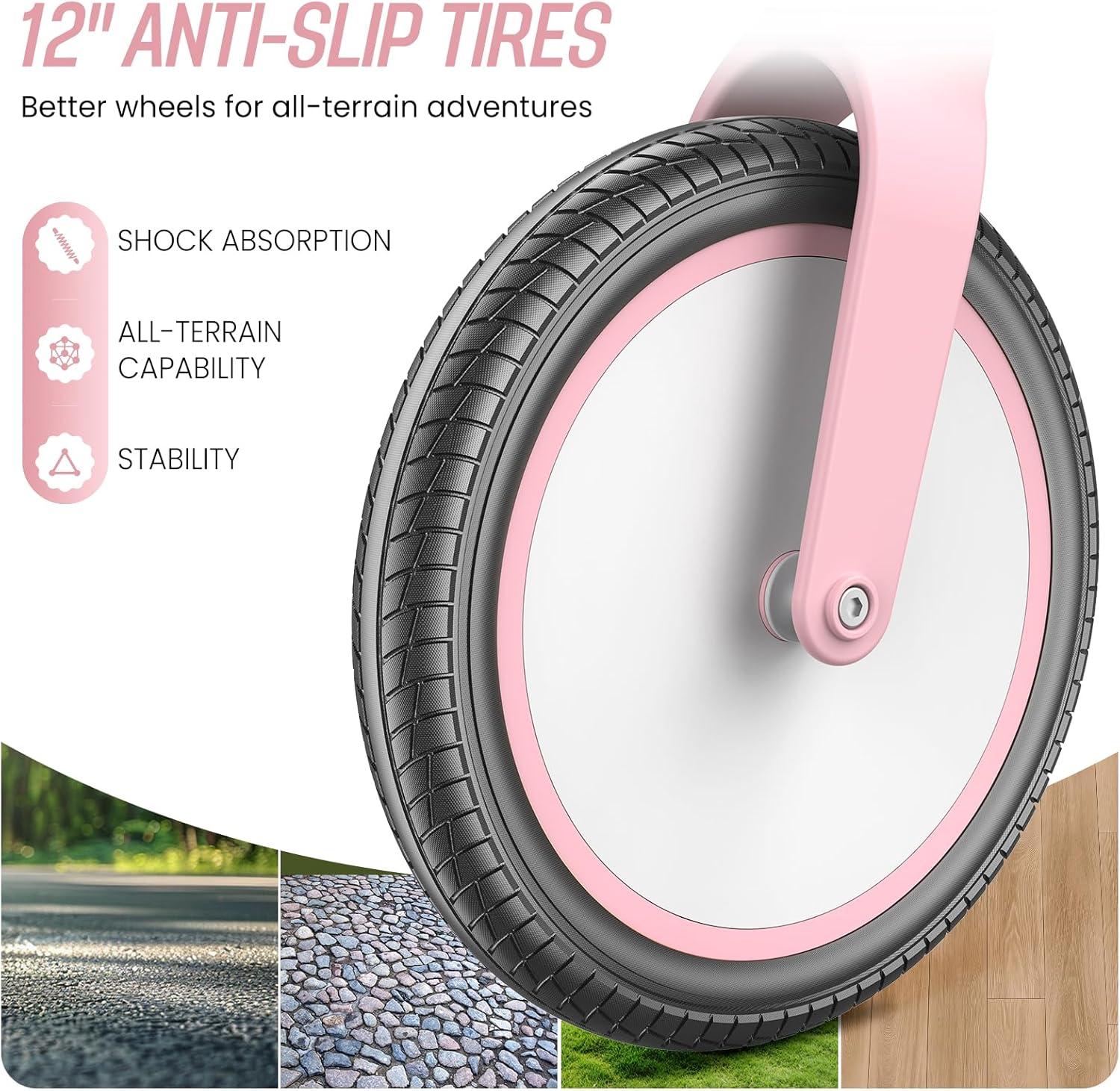 NON-SLIP TIRES: High-quality tires with patterns can provide maximum grip across terrains. 135° safety steering limit prevents tip-overs. Toddlers can glide smoothly indoors or outdoors, boldly exploring.